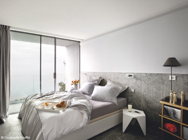 Vert d'eau, gris et blanc pour cette chambre au style romantique.